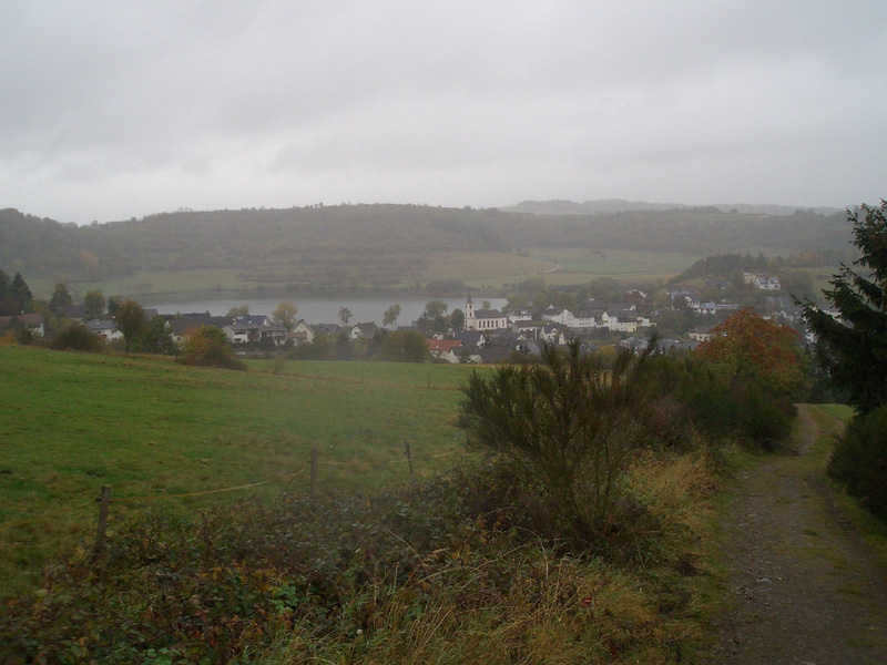 Schalkenmehren im Regen. Links das gleichnamige Maar.