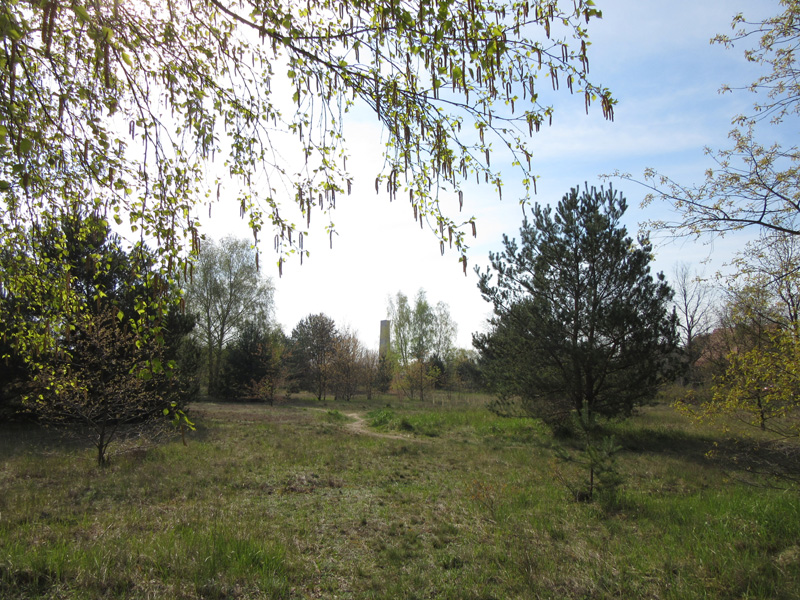 Idyll und Grauen – die Stele in der Bildmitte steht in der Gedenkstätte des ehemaligen KZ Sachsenhausen