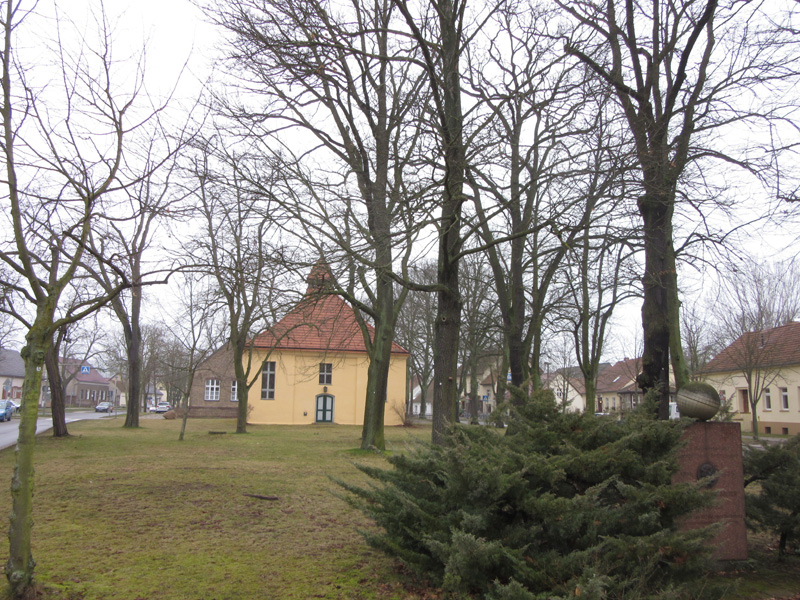 Rechts ein Denkmal für Johann Jacob Baeyer, den Begründer der europäischen Gradmessung, der in Müggelheim geboren wurde.