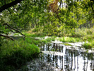 Der Weg ist oft ein schmaler Pfad. Ans Ufer der Löcknitz kommt man nur selten, sie schimmert zwischen den Bäumen und Büschen aber immer wieder hindurch. Einige Abschnitte führen aber auch durch ganz klassischen brandenburgischen Hochwald.