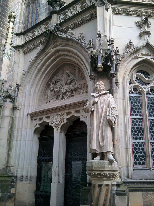 Martin Luther wacht vor der Marienkirche, an der Kirchentür seine 95 Thesen