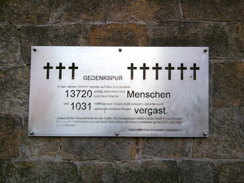 "In den Jahren 1940/41 wurden auf dem Sonnenstein 13.720 geistig behinderte und psychisch kranke Menschen und 1.031 Häftlinge aus Konzentrationslagern, darunter auch zahlreiche jüdische Bürger, vergast.