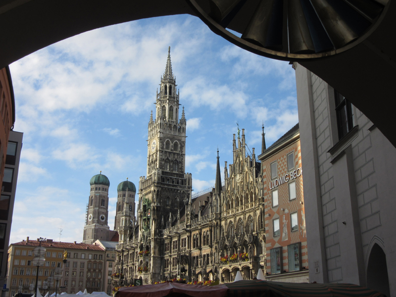 Marienplatz mit Neuem Rathaus, im Hintergrund die Frauenkirche